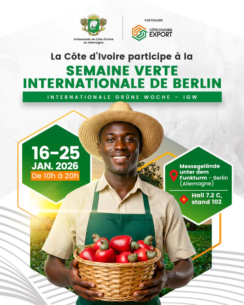 La Côte d’Ivoire prendra part à la 100ᵉ édition de la Semaine Verte Internationale de Berlin (Internationale Grüne Woche – IGW), qui se tiendra du vendredi 16 au dimanche 25 janvier 2026 en Allemagne. Cet événement de référence mondiale dédié à l’agriculture et à l’agro-industrie constitue une plateforme majeure d’échanges autour des enjeux liés à […]